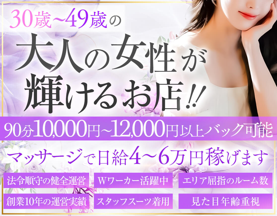 | 当店について | 当店では経験者、未経験者問わず30歳~49歳の大人の女性が活躍中しています!OLやシングルマザーなどWワークで働く方が多く在籍しています!初めての方の為の研修やスタッフによるサポートも充実しておりますので安心してお仕事を始めて頂くことができます! |